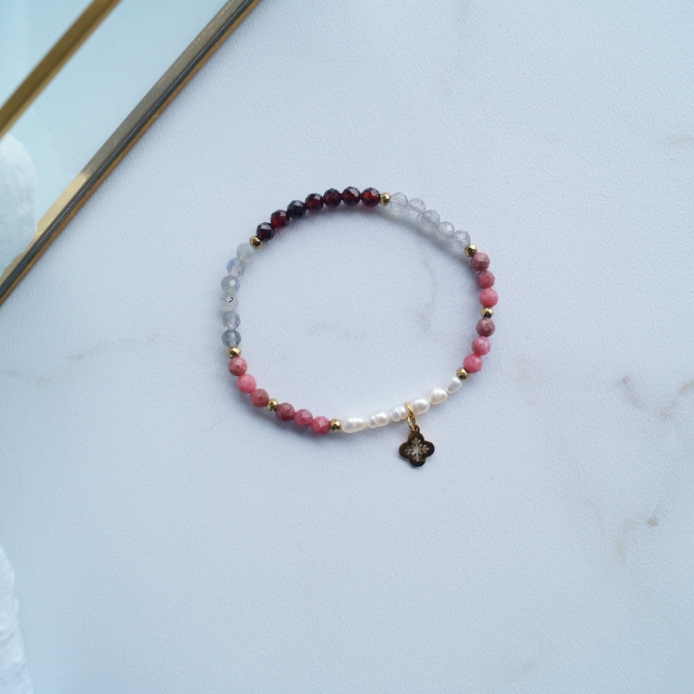 Jasna biel perełek, subtelny róż rodonitu, błękitne migotanie labradorytu oraz głębia czerwieni granatów. Do tego maleńka złota zawieszka.