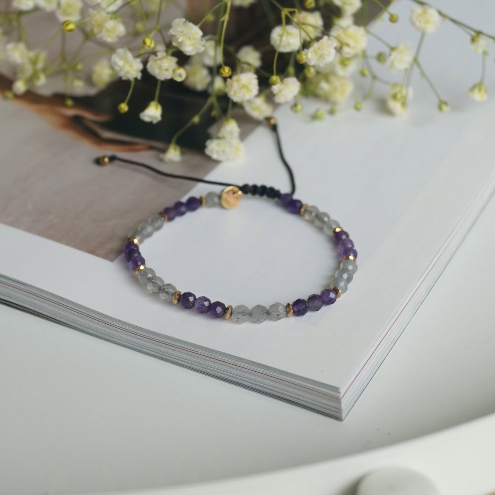 Bransoletka z ametystu i labradorytu — kamieni światła i intuicji. Ich subtelne spotkanie przynosi ciszę, lekkość i wewnętrzny balans. Przestrzeń to chwila oddechu, w której odnajdujesz siebie