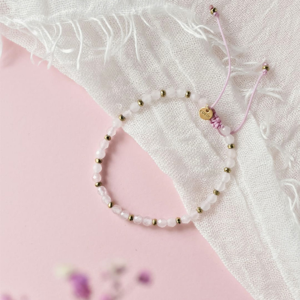Kiedy patrzę na tę bransoletkę widzę kobietę pełną siły i energii. Kamyki kwarcu połyskują na jej nadgarstku. Biegnie zamyślona przez miasto, a może na spotkanie… Bransoletka Różowy Kwarc to kolejna propozycja bransoletki na sznureczku. Subtelna bransoletka będzie idealnym  prezentem dla Fanki klasycznych dodatków. Dodam – to piękny prezent, aby wyrazić miłość. Różowy kwarc to symbol miłości. Na Walentynki taka bransoletka może być niespodzianką, którą zaskoczysz Ukochaną na romantycznej kolacji. Kamyki są koloru mlecznego z zabarwieniem jasnoróżowym. Aby podkreślić ich kolor dodatkowo użyłam różowego sznurka. Do kompletu możesz też kupić pierścionek z różowym kwarcem.