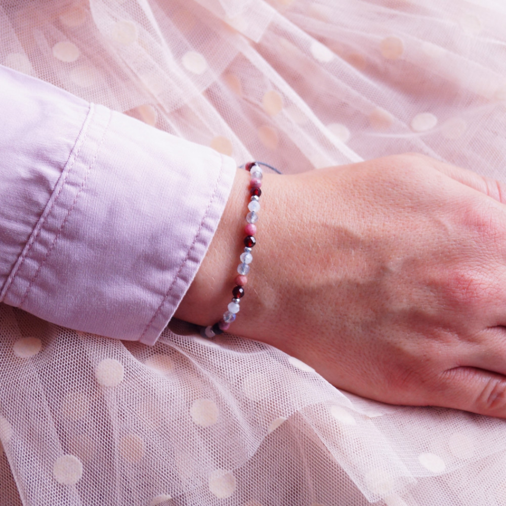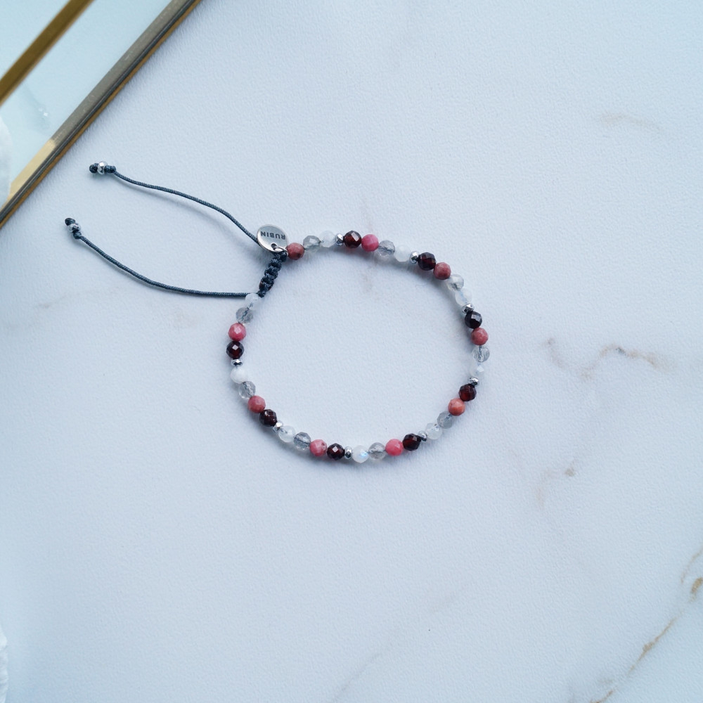 Co by było, gdyby którejś z nich zabrakło? Zmienność emocji, która stale Ci towarzyszy, może być dobra. Zgodzisz się ze mną? Właśnie o tym myślałam, gdy połączyłam kamienie rodonitu, granatu, labradorytu i kamienia księżycowego. Łagodność obok intensywności. Jasność obok ciemności. Być może potrzebujesz harmonii i czegoś, co pomoże Ci zaakceptować Twoją zmienność emocji? Chciałabym, żeby ta bransoletka była malutkim przypomnieniem, że każda Twoja emocja jest ważna, właśnie taka jaka jest. Do wyboru są dwa modele: ze złotymi lub srebrnymi hematytami. Który wolisz?