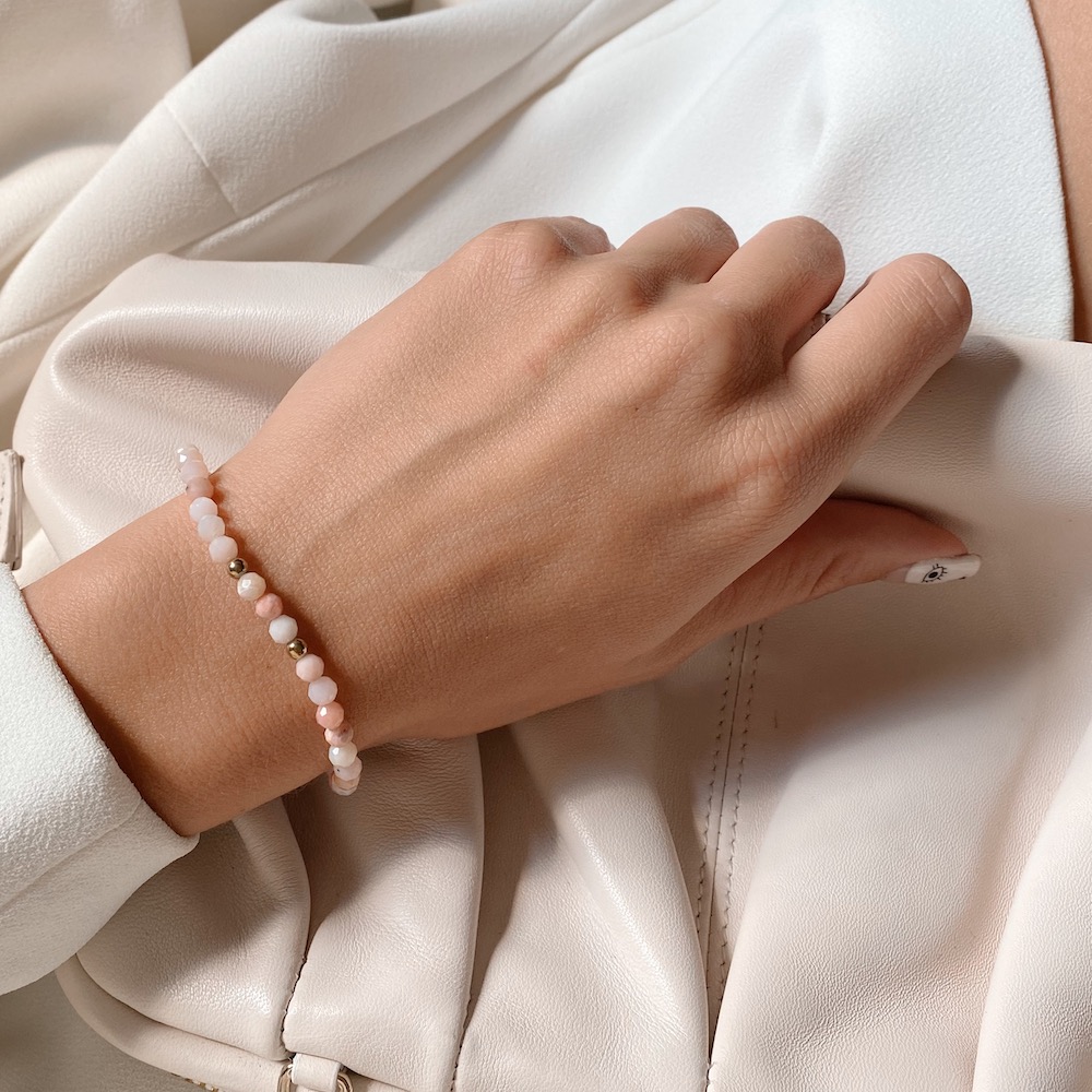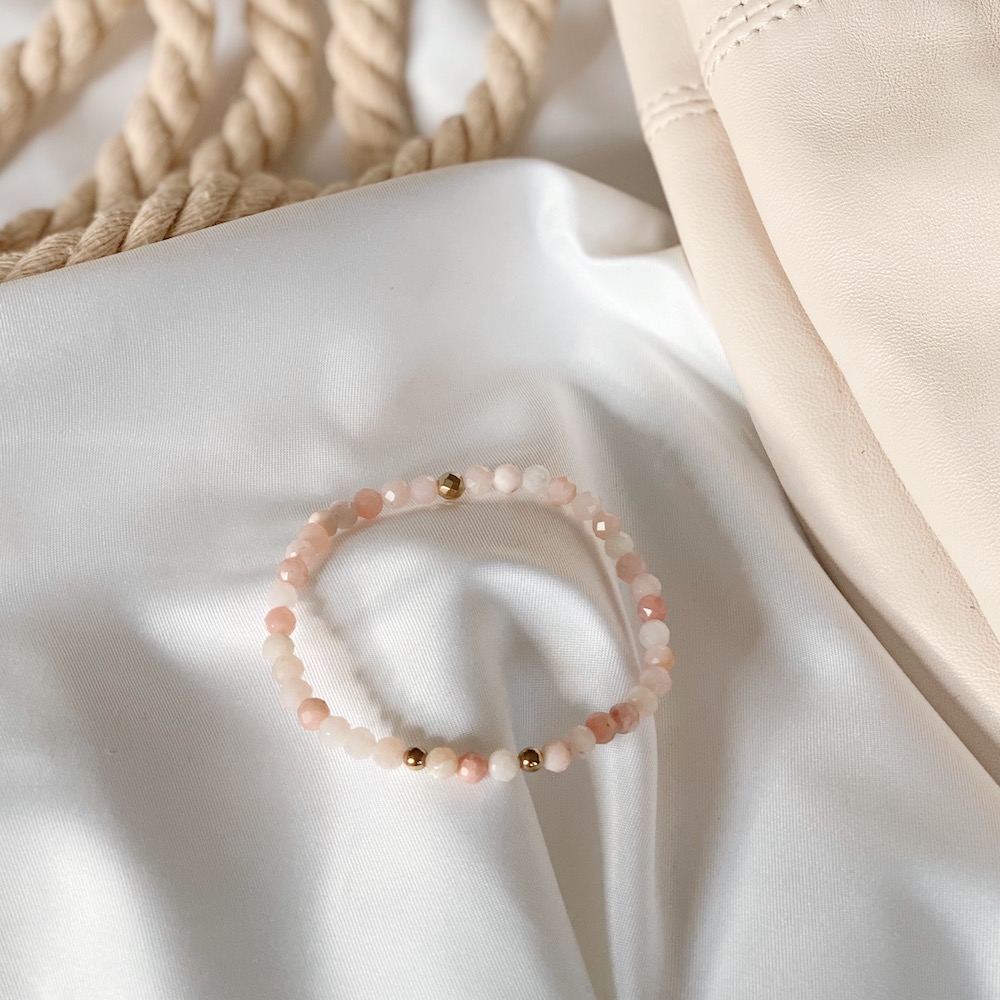 Bransoletka z kamieni różowy opal peruwiański Subtelna bransoletka z naturalnych kamieni różowego opalu peruwiańskiego to doskonały prezent dla bliskiej Ci osoby lub dla Ciebie. Urok jasno-różowych kamieni został podkreślony złotymi kamieniami – hematytem.