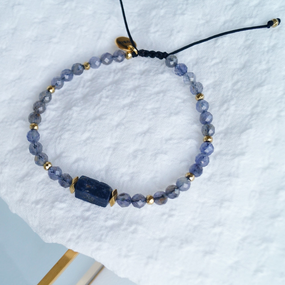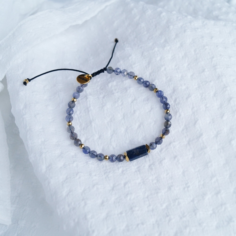 Bransoletka niebiańska została wykonana z trzech kamieni: iolit, szafir i hematyt. Szaro – niebieski iolit  kolorystycznie łączy się z bryłką szafiru, a złote hematyty dodają bransoletce elegancji. Tu znajdziesz poradnik jak wybrać prawidłowy rozmiar bransoletki