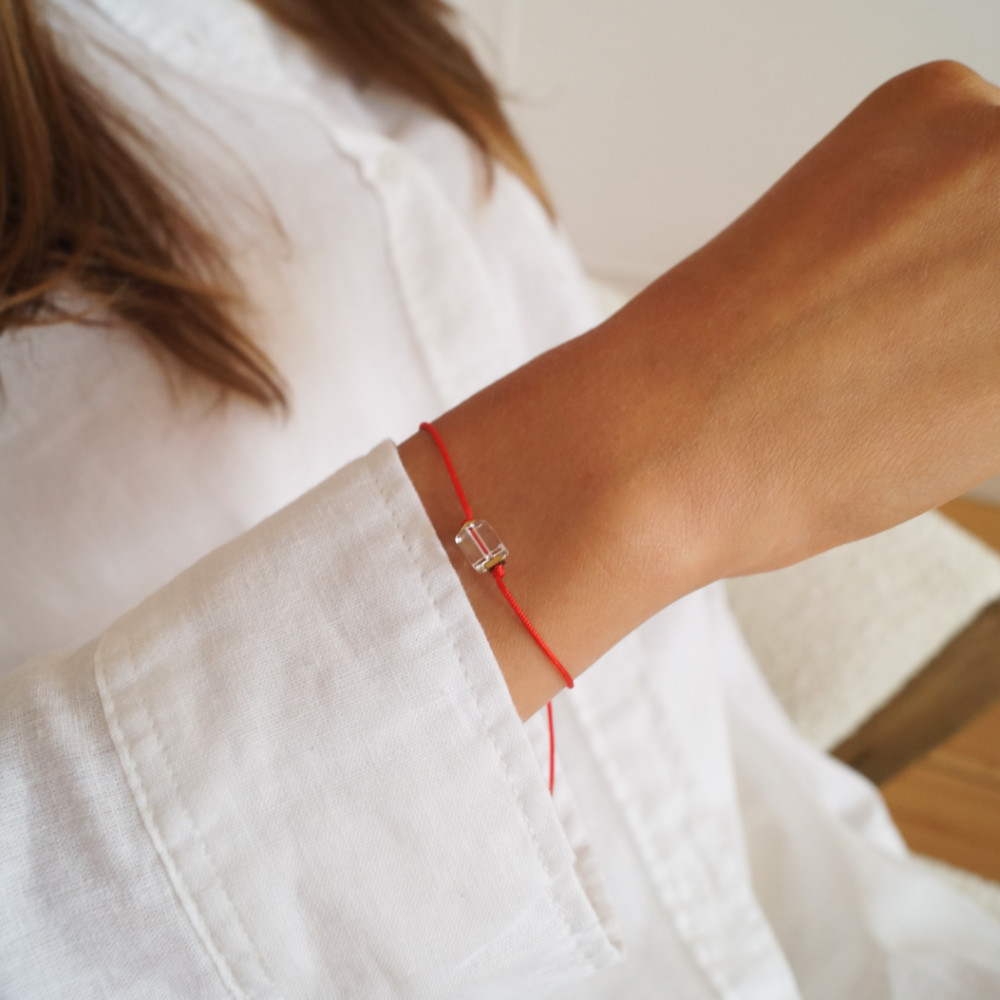 Bransoletka na sznureczku z regulowanym zapięciem, pasuje na nadgarstek 15-17 cm.