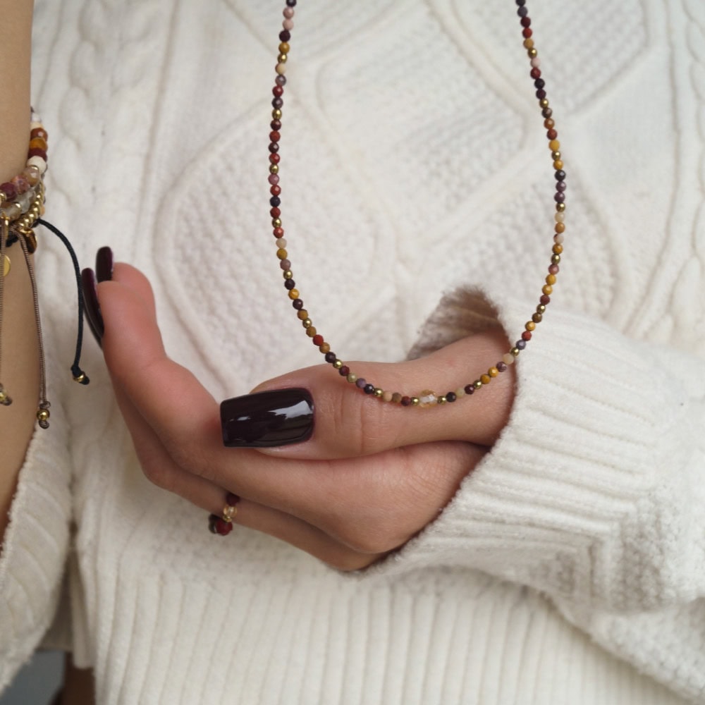 To wyjątkowa kompozycja łącząca ciepło kolorów ziemi z promiennym blaskiem cytrynu. Mokait w odcieniach brązu, czerwieni i beżu nadaje naszyjnikowi głębi i naturalnej elegancji, przywołując na myśl jesienną harmonię natury. Centralnie umieszczony kamień cytrynu, o złocistym kolorze, wprowadza do naszyjnika promień światła, symbolizując radość i pozytywną energię.