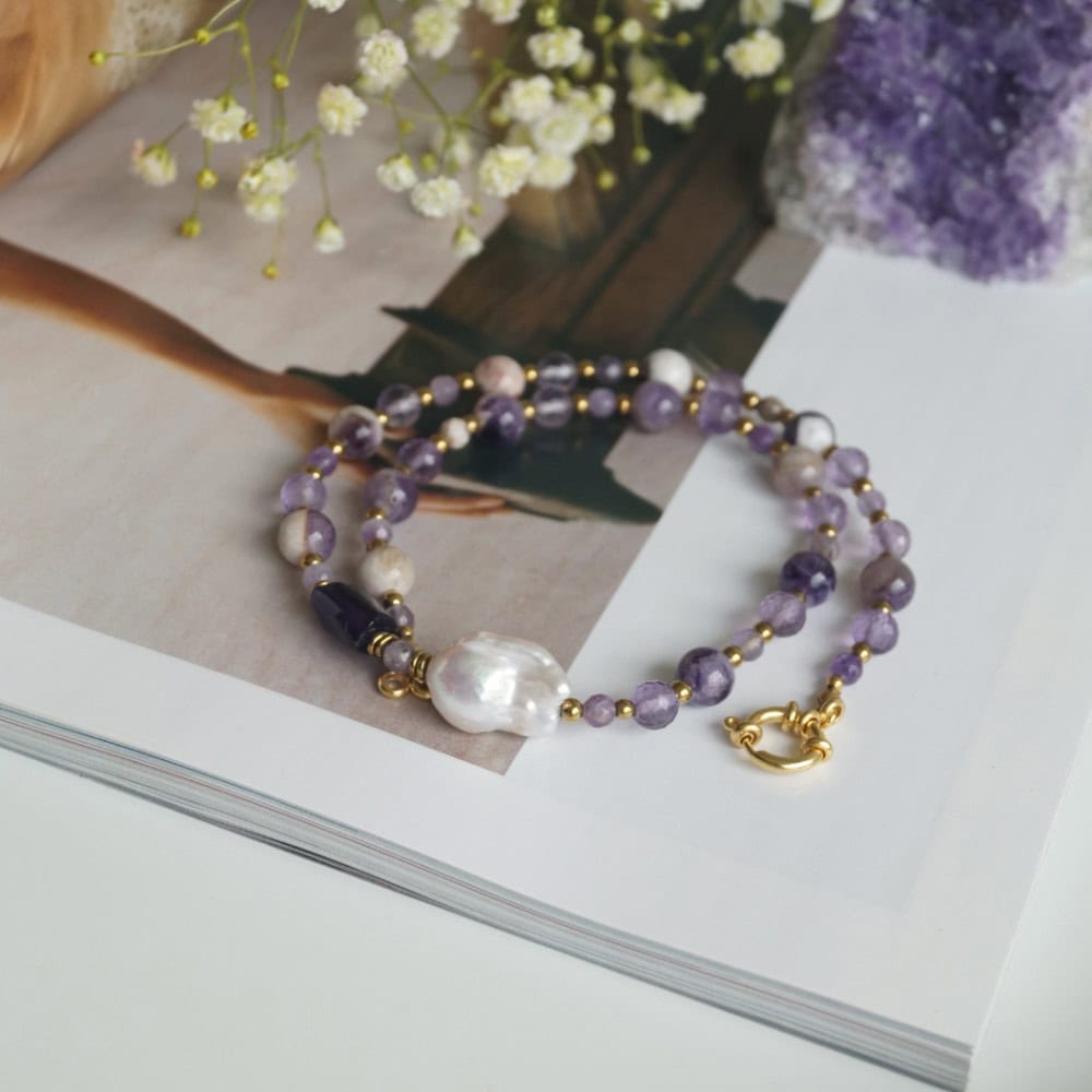 Naszyjnik Źródło z kolekcji MIRA to opowieść o świetle, które płynie z wnętrza. Połączenie trzech odcieni ametystu i dużej, nieregularnej perły tworzy subtelną grę barw i faktur — od chłodnych tonów po ciepły połysk. Każdy element został dobrany z dbałością o naturalną harmonię, dzięki czemu naszyjnik emanuje spokojem i elegancją.