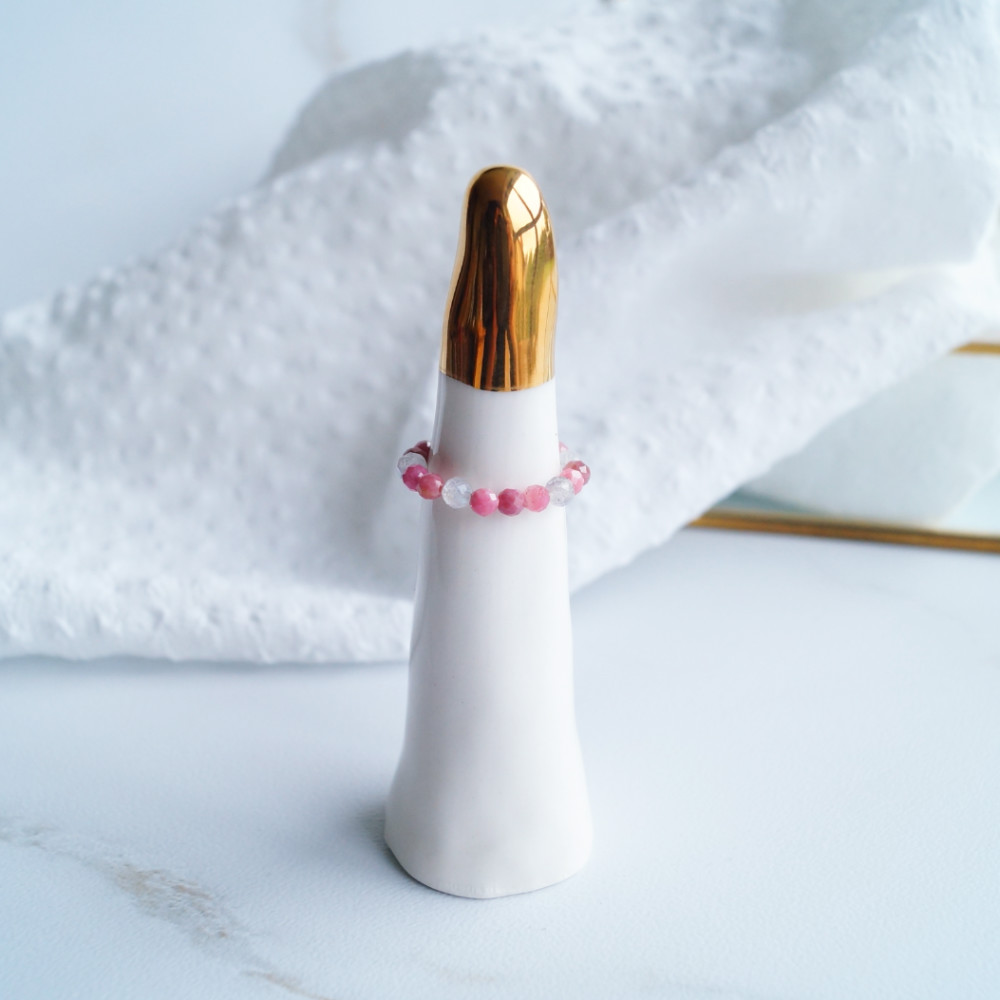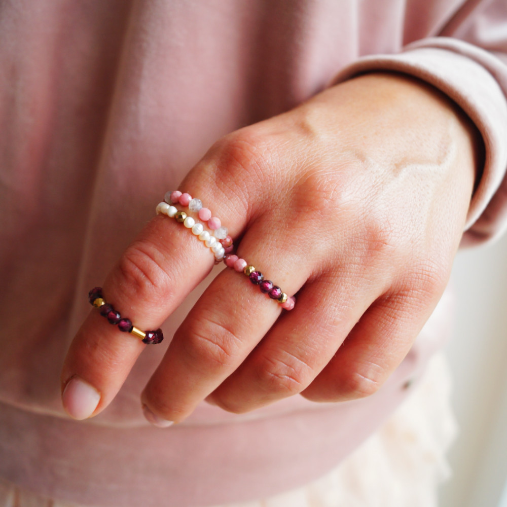 Widziałaś kiedyś niebo w kolorze różowym? Bardzo lubię na nie patrzeć. Bezkres koloru, łagodne fale z chmur kojarzą mi się z dobrostanem i ukojeniem. Tak dobrze jest zatrzymać wzrok na horyzoncie różowego nieba, kiedy codzienność wymaga ciągłego zaangażowania. Podziwianie kolorów na niebie sprawia, że czas na chwilę się zatrzymuje. Jeszcze głęboki wdech i można wracać. Chciałabym, żeby ten pierścionek przypominał Ci o różowym niebie. Wybrałam połączenie subtelnego różu rodonitów z szarym labradorytem, bo kombinacja tych kolorów daje ukojenie.
